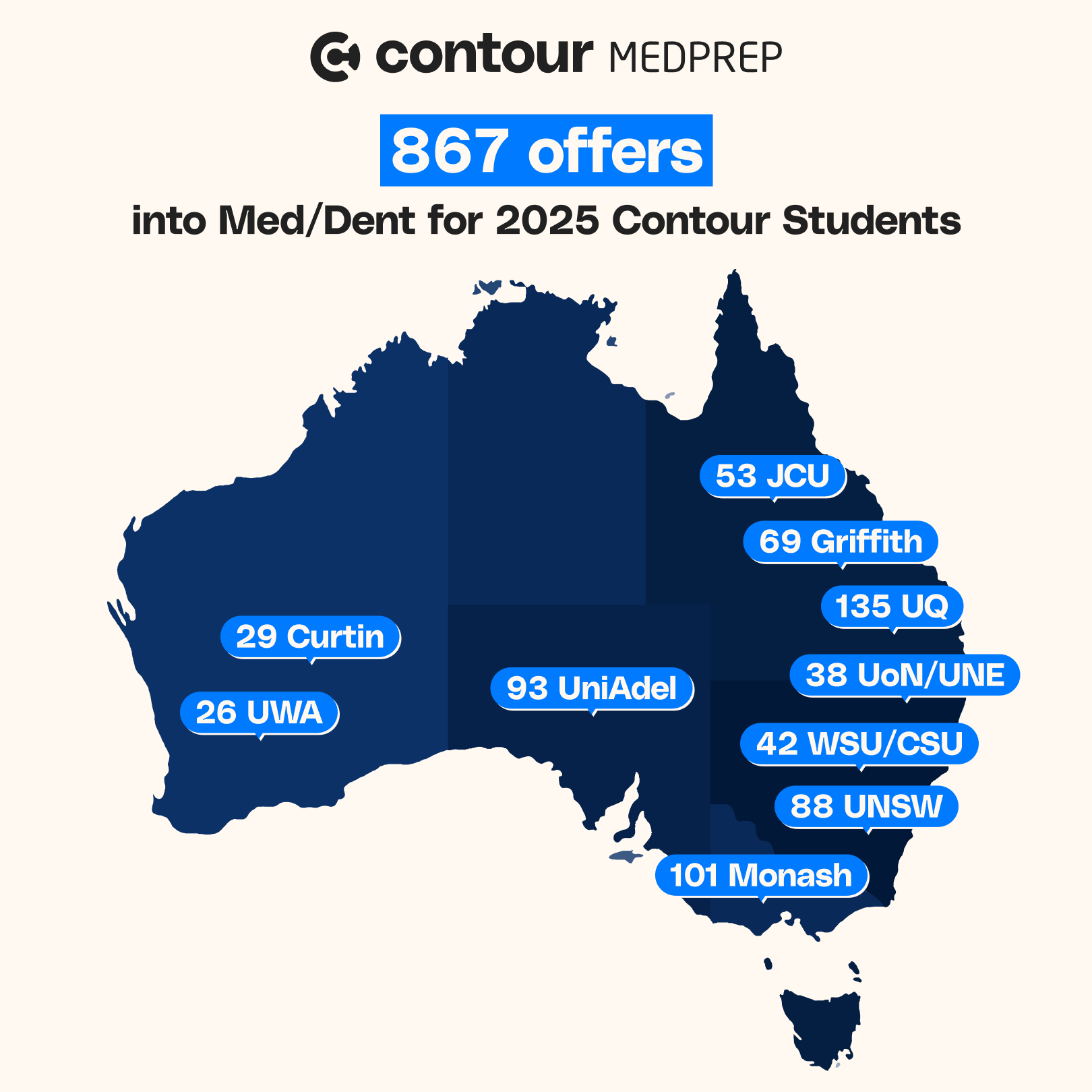 In 2026, more than 500 Contour MedPrep students received at least one Medicine or Dentistry entry offer, securing 867 total Medicine and Dentistry entry offers across universities around Australia.